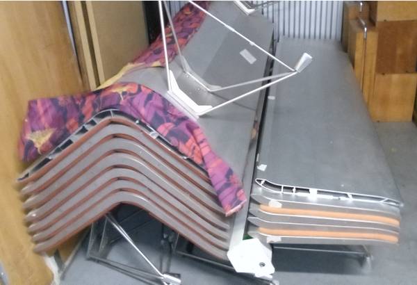 High quality materials and construction (anodized aluminum frame + chrome tipped steel stilt legs). Normal wear on existing fabric and readily re-upholstered (I can economically reupholster them myself to order--quick turn-around).