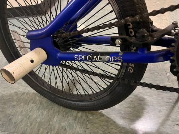 Mongoose Freestyle Bike is a durable, single-speed freestyle bike with 20 inch wheels in cobalt blue/white. It is the Special Ops Cell edition with the skull on the seat. The bike is outfitted with a handcrafted, high-tensile OvalTube steel freestyle reinforced frame and a Hi-Ten fork, giving riders nice control whether riding on trails or the street. The bike has front pegs and rear pegs. The bike also includes sure-stopping front and rear caliper brakes and extra-wide 2-inch tires that roll smoothly over both pavement and grass. Other features include two-piece freestyle bars with an alloy stem, an adjustable quick-release seat, 20-inch wheels, and a one-piece crank with a 44t stamped ring.
