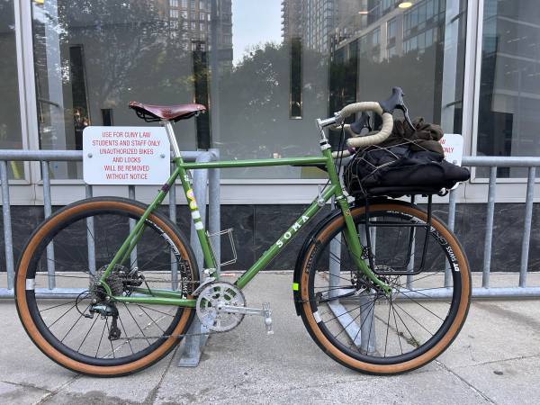 650b wheels, disk. Mishmash of parts including vo grand cru cranks and chainring, trp hoods and brakes, a well worn brooks saddle which will be included for an extra 50 and an Origin 8 froggy style...