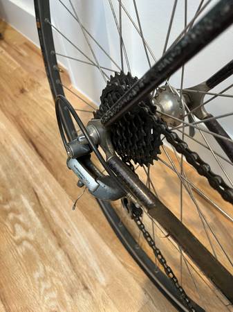 Overall bike is in great functional shape, components all work well. Some wear and tear on the frame from NYC use with a hefty lock. As you can see, will need a new saddle and general tune/clean up.