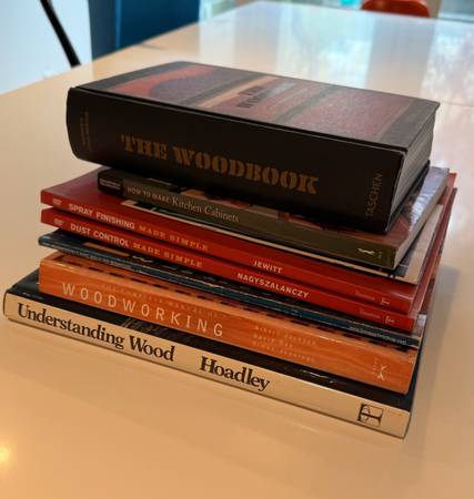Seven woodworking books all in great condition. The Dust Control and Spray Finishing books come with step-by-step DVDs.