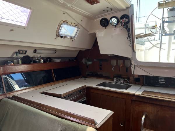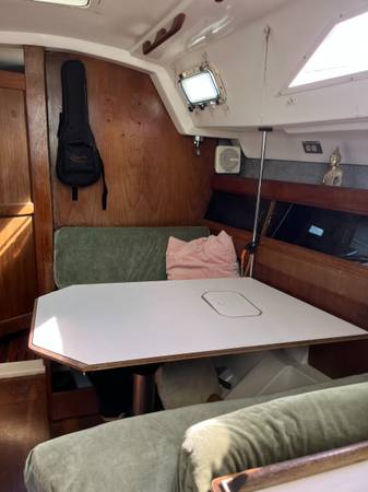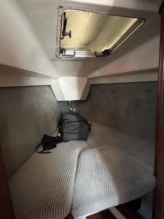 Below deck, it has the largest cabin I've ever seen on a 31-foot boat. Large settee, V-berth and huge aft cabin for storage.