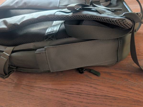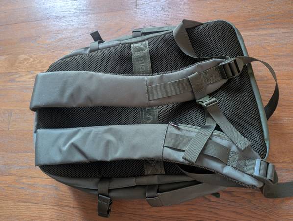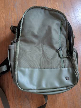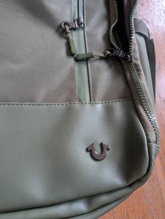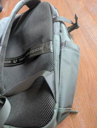 Features: The backpack is made of durable nylon with a canvas lining, and features a zip closure and adjustable straps. It includes inner and outer pockets, an organizer, inner dividers, and a laptop sleeve. The front of the bag features the signature True Religion horseshoe logo.