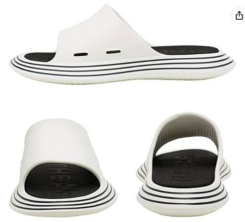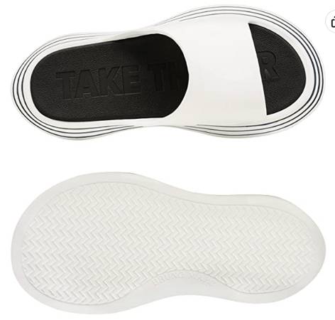 The slides are 100% soft EVA. The EVA footbed and outsole provide cushions and support while you walk and bring you a smooth and comfortable wear experience. The EVA strap means you can get them wet and wash them without any problem. These slides make great recovery shoes after a tough run or workout, letting your feet relax and comfort.
