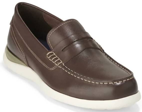 This updated classic penny loafer has an angular moc-toe design and a high vamp. This comfortable dress shoe can be dressed up or down, and you can polish it. The footbed is particularly comfortable.