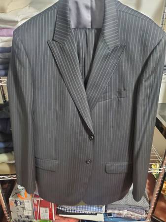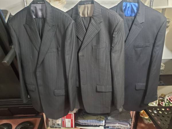 3 quality expensive pinstripe wool suits..size 44 regular jacket and size 36 pants. Pants can be opened to a 38 if you need that. These are vintage style suits 3 button with pleats and cuffs. Pants are Relaxed fit.