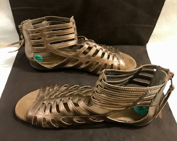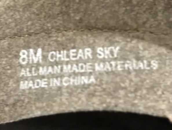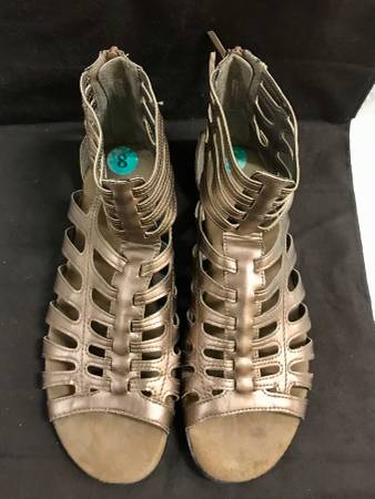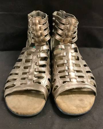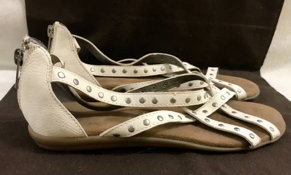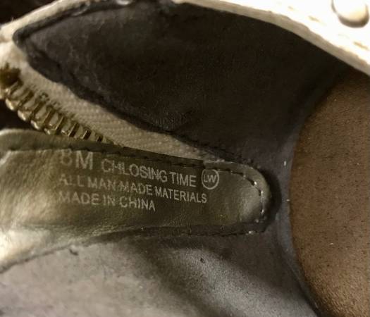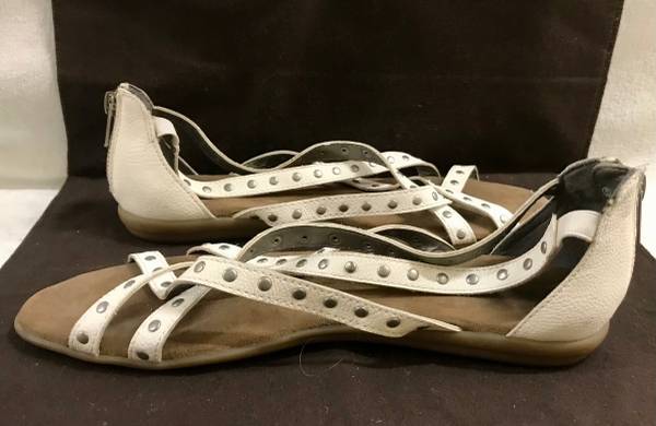 *The size 8M white ones (Aerosoles “Chlosing Time”) are decorated with metal studs and have back zippers. Their faux-leather uppers that are in pretty decent shape; their inner soles and bottoms are worn.