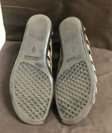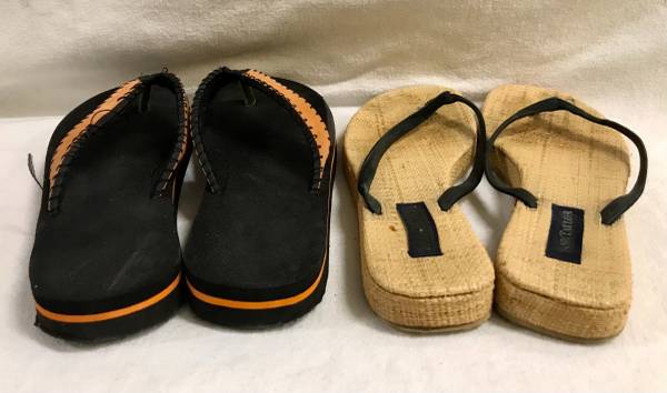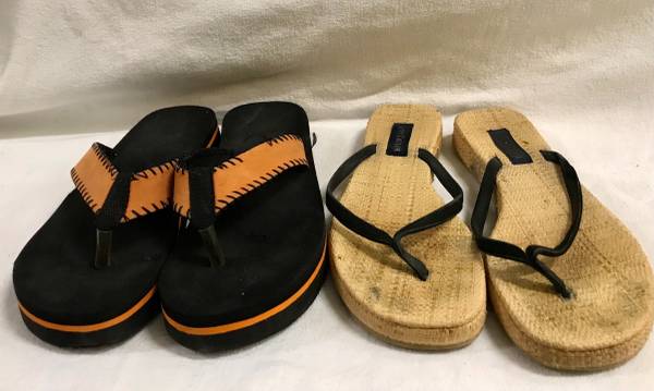 *The flip flops are a bit more damaged. The orange and black ones are great for the pool. They have rubber soles that are starting to crack and their stitching is coming loose at places. The black Ann Taylor ones have rope espadrille-style bottoms with nonslip rubber soles that are a bit worn. I can’t find the size on either pair, but I assume they are also 8’s.