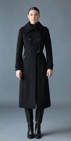 ELODIE is a long tailored coat for women made from soft responsible double-face wool. A handmade fitted silhouette, the double-breasted closure, epaulettes, and cuff tabs enhance its sharp, tailored feel. The structured asymmetrical shirt collar adds protection and unexpected edge.