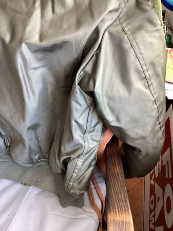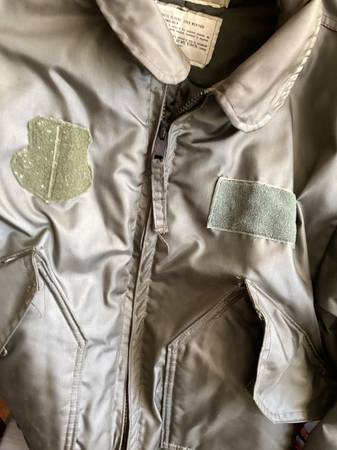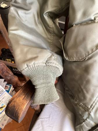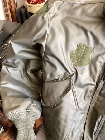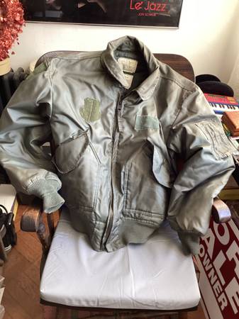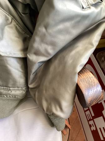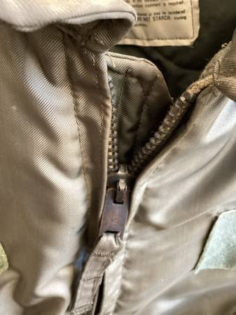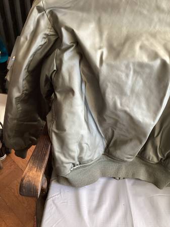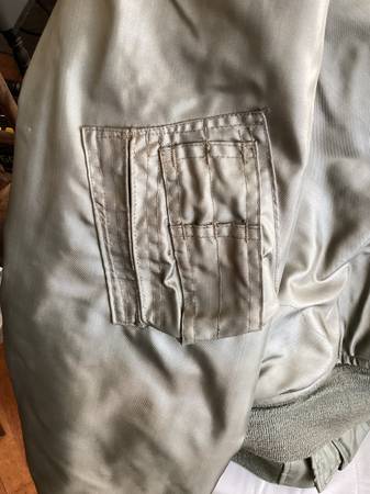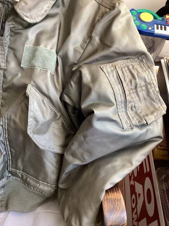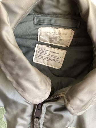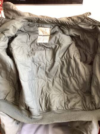 Here is a used green military cold weather flyers jacket. Type cwu-45/p, size large 42-44, see posted label photo. Excellent heavy duty zipper, Velcro closed pockets left arm has a pocket and place...