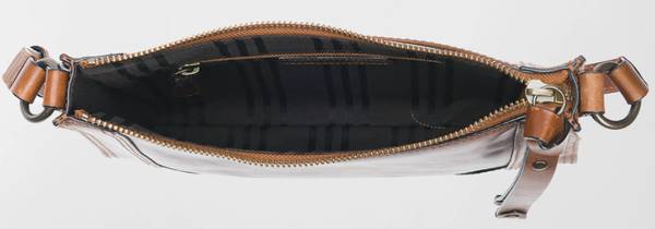 Details: zipper closure, 1 interior slip pocket, 1 back exterior pocket, adjustable leather strap, printed fabric lining.