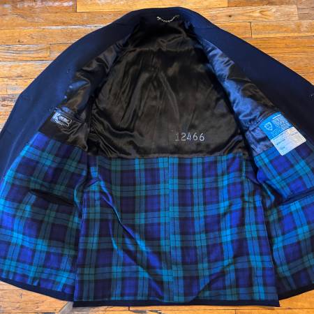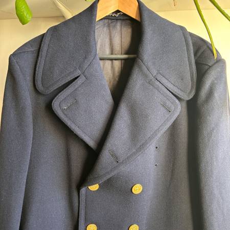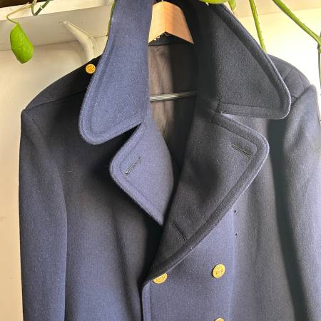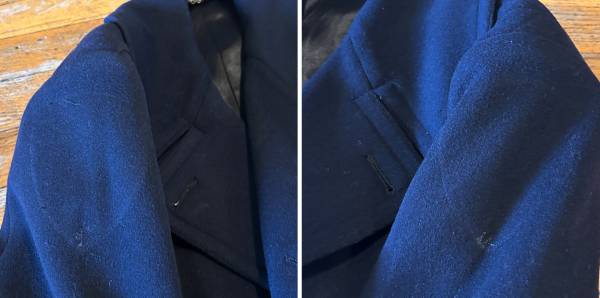 Very good condition. No rips, tears, or moth spots. Clean inside and out. Heavy wool like a vintage Navy Pea Coat. Pockets, cuffs, shell, and lining are all in great shape. All original buttons. Visible remnants of where there were patches on the shoulders and cuffs, and a slight smudge where one of the cuff patches was (shown in pics).