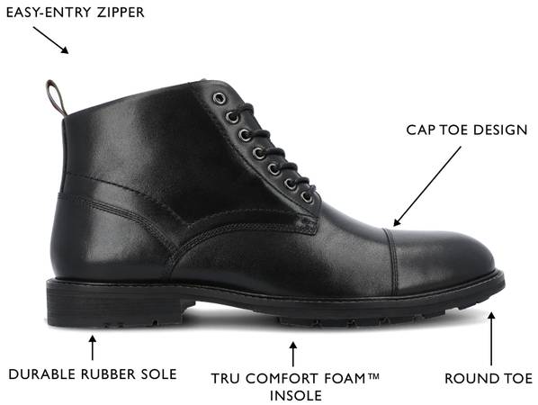 The Avrum boot by Thomas & Vine is an elegant but functional look you can pair with anything. Genuine leather uppers and a 6 mm Tru Comfort Foamâ„¢ insole give this round-toe boot the utmost in comfort. The look is complete with cap-toe, a cushioned collar, and a classic lace-up fastening.
