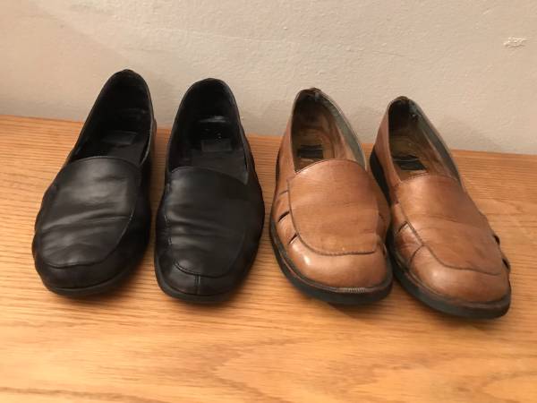 Two pairs of comfortable but attractive Aerosoles slip-on leather upper flats: black loafers and tan moccasins