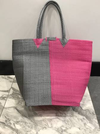 1. Pink and grey plastic hand bag with a plastic knot and loop clasp closure, in a faux knit texture with faux crochet details. This is a great choice for pool or beach or grocery shopping. Or you could wear it as a handbag. It also works as home decor/storage — eg, use it to store yarns and needles by your favorite chair… It is in very good condition.