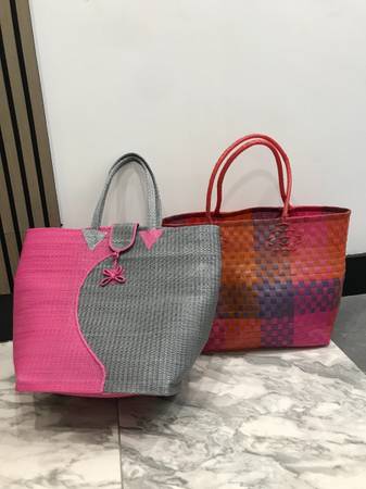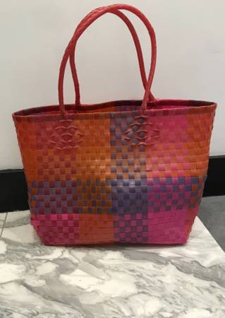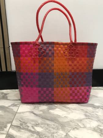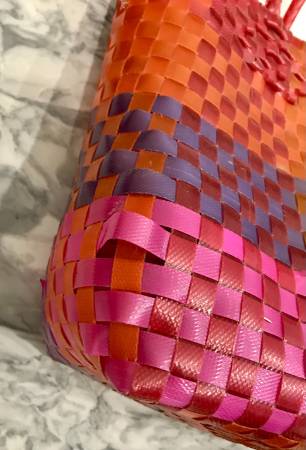 2. Large plastic basket weave tote in a bright orange/blue/pink plaid design. Though it is hard to tell from the photos, this is the bigger one of the two. Its roomy interior makes this one great for laundry, shopping, the pool, the beach or the gym. It easily stands upright, so it also works as a colorful and functional storage bin or laundry basket. The weave is a little loose at one corner (see photo) but it is overall in very good condition.