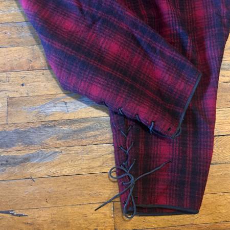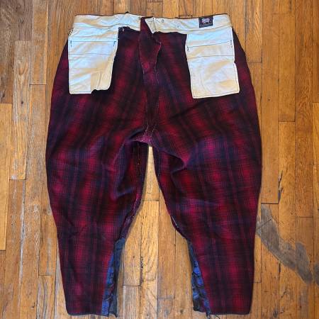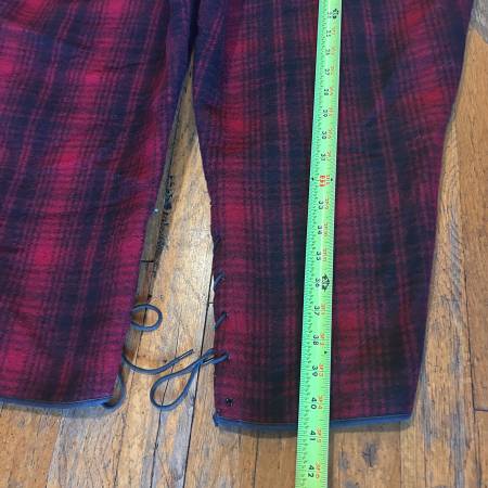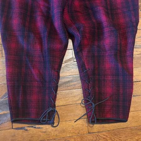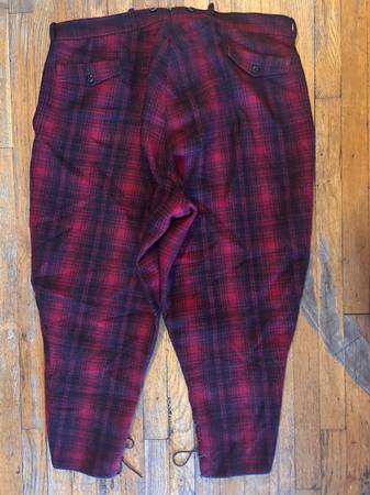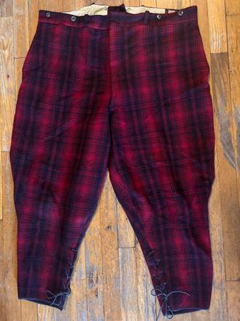 Superb condition. Clean inside and out. No rips, tears, stains or moth spots. Zipper, pockets, and laced ankle cuffs are in great shape. All original suspender buttons. Truly excellent example of these classic, vintage outdoorsman pants.
