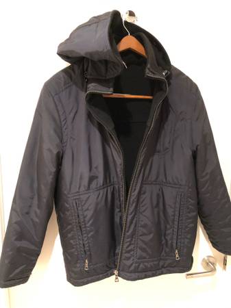 Andrew Marc winter coat; like new condition; men's medium; waist length; reversible navy blue nylon/polyester; reversible black wool; detachable hood; cash only; no delivery; must pick up