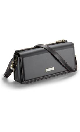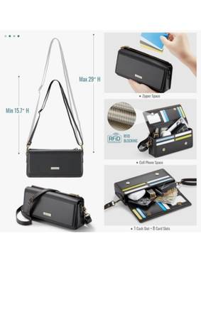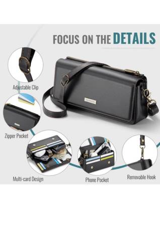 Adjustable strap, zipper closure, multiple card slots, zipper pocket, phone pocket. RFID blocking. A black leather crossbody purse that can also be used as a clutch. It features a zippered closure...