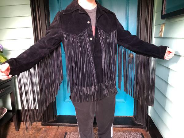 Get ready for the fall weather with this unique, stylish Navy Blue Suede Fringed Jacket. It is warm and well made. It is in excellent condition despite missing 2 fringes. The jacket is a...