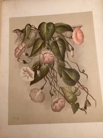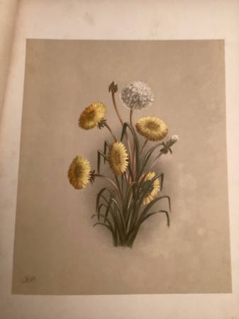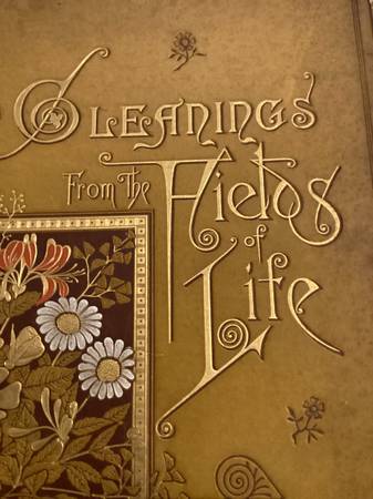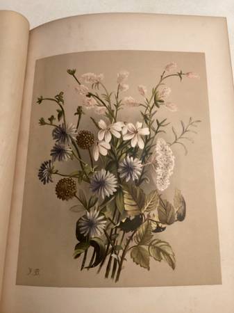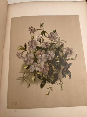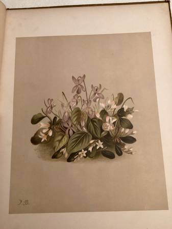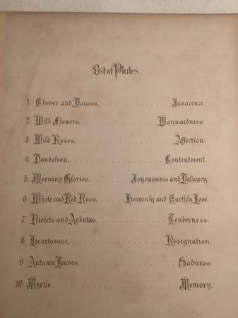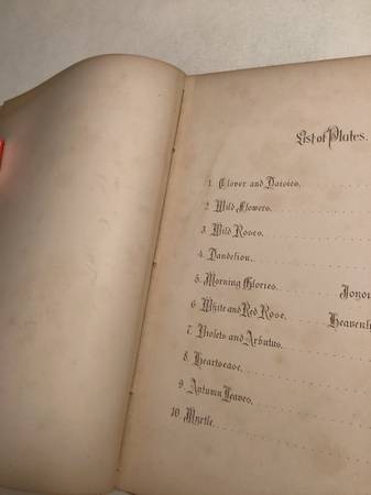 This is a 1882 first edition of Florence Baily, don’t judge a book by its cover. Highly embossed gold leaf cover with 10 beautiful color printed plates and poems. Cover is pretty worn at the seam, someone put red tape on it, inside is in excellent condition, printed on heavy board with tissue paper between each page. See photos