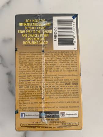 2017 Topps Baseball Series 1 Celebrates the Greatest Moments, Biggest Stars of Today & Newly Debuting RC?s! Collect all 350 Cards in Series 1 including all-New Inserts, Autographs,1 of 1 Cut Signatures & Relics! Look for Special Retail Exclusive Awards Inserts, Parallel & Autographs! Look for Cards, Parallels, Relics & Rare Autographs of Sandy Koufax,Cal Ripken,Ken Griffey Jr .Mike Trout,Bryce Harper,Ichiro & More! Look for Sequentially Numbered Parallels including 1/1 Platinum & Printing Plates! Every Box includes (5) Jackie Robinson Day Inserts & at least (10) Other Inserts! Collect Inserts of Topps Salute, Bowman Then & Now, 1987 Topps Baseball & More! Look for Cubs World Champions Relic & Autographed Relics including Kris Bryant & Kyle Schwarber! This Product is Absolutely Loaded! Good Luck with your Pulls!