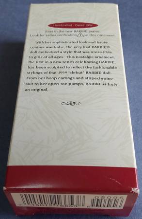 Hallmark's Keepsake ornament of the 1959 Barbie in the black and white striped swimsuit. The ornament is MIB and NRFB. It is the first in the series and the box is in like new condition. Local...