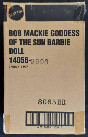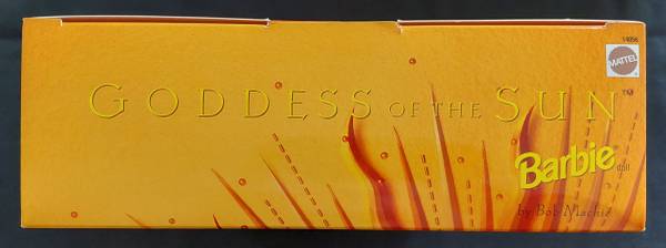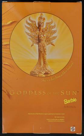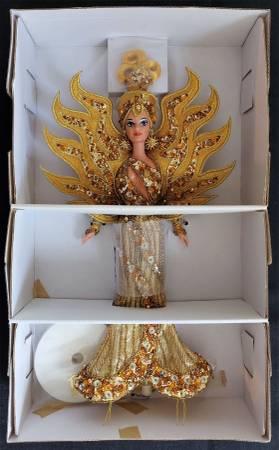 Befitting a sun goddess, Barbie has a collar that rises like flames around her. The golden embroidery outlines each flame. The boarder of embroidery and sequins with beads that flicker in the center echo the radiance of her gown. Every bead, sequence is sawn by hand. 8th in series, her hair is colored unusual gold yellow and swept up though a magnificent headpiece accented with two golden rhinestones. She is wearing sun shaped gold tone earrings. Shoes, signed illustration, and brochure are included in the original shipping and mint doll box.