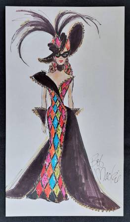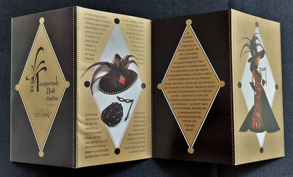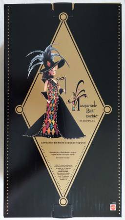 The Bob Mackie collection Barbie (1993) includes a signed illustration, stand, brochure, mask, brush, shoes and an original box, as well as the shipping box. which are all mint. Originally purchased and kept in the shipping box for 30 years. The hat's feathers are fragile.