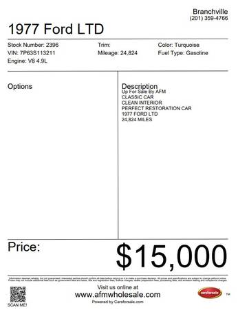 1977 FORD LTD - stk#2396 24,824 MILES V8 4.9L GAS CLASSIC CAR CLEAN INTERIOR PERFECT RESTORATION CAR UP FOR SALE BY ADVANCED FLEET MANAGEMENT LOCATED AT 3 KEMAH LAKE ROAD, BRANCHVILLE, NEW JERSEY...