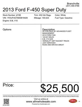 2013 FORD F450 VERSALIFT 29FT BUCKET TRUCK - stk# J2190 140,521 MILES 6.8L V10 GAS JUST SERVICED RUNS AND DRIVES GREAT UP FOR SALE BY ADVANCED FLEET MANAGEMENT LOCATED AT 3 KEMAH LAKE ROAD,...