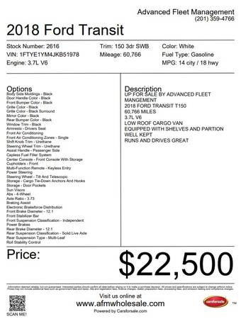 2018 FORD TRANSIT T150 LOW ROOF CARGO VAN - stk#2616 60,766 MILES 3.7L V6 GAS EQUIPPED WITH SHELVES AND PARTION WELL KEPT RUNS AND DRIVES GREAT UP FOR SALE BY ADVANCED FLEET MANAGEMENT LOCATED AT 3...