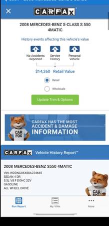 Hello selling a Beautiful 2008 Mercedes-Benz S-Class S 550 4MATIC Luxury LWB only 83.550 Original Miles Clean CarFax No Accidents Clean Title beautiful color combo Gray on brown interior comes loaded with a lot of amazing options Brown leather Interior Panoramic roof Alloy wheels power folding mirrors NIGHT VISION navigation rear camera front and back park assist sensors front and rear heated and cooling ventilated seats Bluetooth fog lamps xenon lights soft closing doors extend rear seating with both power and reclining rear seats with door and seat controls Push start keyless entry power lift gate trunk adjustablxe air suspension steering controls and much more options nice strong V8 engine smooth transmission 4 wheel drive excellent condition Benz engine transmission air conditioning and heat all working beautiful absolutely no check engine or other lights on the dash clean title is on hand .right front shock will be needed near future.. 646 70l 4438
