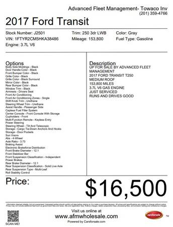 2017 FORD TRANSIT T250 CARGO VAN - stk J2501 MEDIUM ROOF 153,800 MILES 3.7L V6 GAS ENGINE JUST SERVICED RUNS AND DRIVES GOOD UP FOR SALE BY ADVANCED FLEET MANAGEMENT LOCATED AT 778 MAIN RD TOWACO NJ...