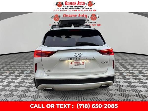 βοΈ Introducing this exceptional 2021 INFINITI QX50 LUXE AWD, presented by Queens Auto, where quality, reliability, and customer satisfaction come first. This well-equipped and fully serviced luxury crossover offers a remarkable combination of performance, comfort, and advanced engineering, making it an ideal choice for drivers seeking a refined and capable vehicle. Showing 93,512 miles on the odometer, this QX50 has been meticulously maintained, fully detailed, and is backed by a Carfax Buyback Guarantee for added peace of mind. The VIN for this vehicle is 3PCAJ5BB9MF104734. As with all vehicles offered by Queens Auto, we proudly remind every customer that we finance everyone. Whether you have no credit, bad credit, or are rebuilding your financial profile, we offer flexible solutions with guaranteed approval opportunities. Visit our website at www.nycusedcars.com for more details, photos, and financing options.The 2021 INFINITI QX50 LUXE AWD is known for blending the practicality of a versatile SUV with the sleek elegance of modern luxury design. Its sculpted lines, aerodynamic profile, and distinctive INFINITI styling make a strong first impression. The signature double-arch grille, sharp LED headlights, and dynamic flowing body panels create an upscale appearance that stands out on any road. The LUXE trim enhances this premium feel with refined exterior touches that elevate the vehicle beyond competing models in its class.Stepping inside, you are welcomed into a cabin that emphasizes craftsmanship, comfort, and advanced technology. INFINITIβs dedication to upscale design is reflected in every detail, from the high-quality materials to the thoughtful placement of driver-centric controls. The interior design focuses on creating an environment that is both luxurious and functional, offering excellent visibility, supportive seating, and an intuitive layout. The seats are designed for optimal comfort on short commutes and long trips alike, with high-grade upholstery materials that enhance the premium feel. The spacious layout offers generous legroom and headroom for both front and rear passengers, ensuring that every occupant travels in comfort.Cargo space is another strong point for the QX50, as INFINITI designed this vehicle with versatility in mind. The rear seats fold easily to create an expansive cargo area, giving you flexibility for transporting groceries, luggage, sports equipment, or larger items. The hands-free liftgate and low loading floor add convenience, making everyday tasks easier whether you are packing for a road trip or simply loading weekly essentials.Under the hood, the 2021 QX50 LUXE AWD features INFINITIβs advanced 2.0-liter VC-Turbo engine, one of the most innovative engines in the automotive world. This variable compression turbocharged engine automatically adjusts its compression ratio to optimize performance and fuel efficiency. The result is responsive power when you need it, smooth acceleration, and excellent efficiency compared to traditional turbocharged engines. Paired with INFINITIβs intelligent all-wheel-drive system, the QX50 offers enhanced traction, stability, and control in a variety of driving conditions. Whether navigating city streets, handling wet roadways, or exploring the open highway, the QX50 delivers confidence and capability.The ride quality is another standout feature of this model. INFINITI engineered the suspension and steering systems to provide a smooth, refined, and composed driving experience. The QX50 absorbs road imperfections effortlessly while delivering precise handling and control. The LUXE trim includes additional comfort features that enhance the overall driving experience, making this crossover a pleasure to operate day after day.Technology is at the core of the QX50βs appeal. This vehicle is packed with advanced features designed to improve convenience, entertainment, and overall driving enjoyment. The dual-touchscreen INFINITI InTouch system offers seamless access to navigation, smartphone integration, multimedia entertainment, and advanced system controls. Apple CarPlay and Android Auto compatibility come standard, allowing you to connect your smartphone and enjoy hands-free calls, music streaming, messaging, and more. The audio system fills the cabin with clear, rich sound, enhancing the driving environment whether you are listening to your favorite music, podcasts, or audiobooks.Driver assistance features are equally impressive in this fully loaded LUXE AWD trim. INFINITI includes a comprehensive suite of safety and security technologies engineered to protect you and your passengers. These include forward collision warning, automatic emergency braking, blind-spot monitoring, lane departure warning, rear cross-traffic alert, intelligent cruise control, and a high-definition rearview camera. These features work together to create a safer driving experience, increasing driver awareness and reducing the likelihood of accidents. The QX50βs sturdy frame, modern structural engineering, and advanced restraint systems further contribute to its strong safety profile.Comfort and convenience features are abundant in the LUXE trim. Premium materials, adjustable power front seats, dual-zone automatic climate control, keyless entry with push-button start, and an elegant interior layout all combine to elevate the driving experience. The panoramic moonroof adds another layer of luxury, providing natural light and an airy atmosphere for passengers. The cabin is exceptionally quiet thanks to INFINITIβs commitment to sound insulation and noise-reduction engineering. Even at highway speeds, the interior remains calm and peaceful, allowing for relaxed conversations and a premium travel experience.This specific QX50 has been fully serviced and professionally detailed by our expert team at Queens Auto. We take pride in ensuring that every vehicle on our lot is carefully inspected, maintained, and prepared to meet high standards of qual