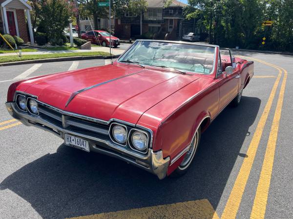 1966 Oldsmobile cutlass, convertible, burgundy, interior, good shape, bucket sheets, V8 330 automatic transmission on the column needs bodywork some rust and bondo runs great Driver side frame needs work. Tires are good. New exhaust new shocks new starter