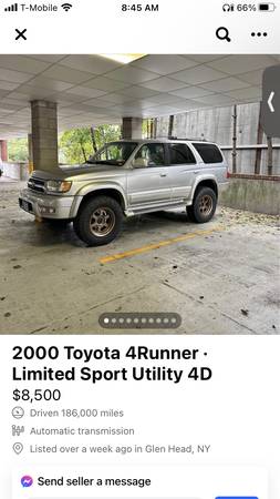 1999 Toyota 4runner, also know as the famous Gen 3. Runs good. Looks good. Has some ware and tear as expected for its age . Seats have rips - see pics. Engine and transmission in great shape. Solid frame, see pics. 259k (timing belt just done)commuter highway miles, NY to CT. Clean title. 4x4 works great. Push button AWD. VIN in pic.
