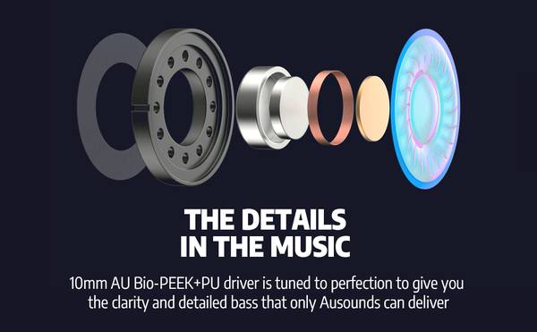 Our 10mm AU PEEK+PU driver is tuned to perfection to give you the clarity and detailed bass that only Ausounds can deliver in a premium true wireless earbud. These earbuds have a unique audio signature with driving low-ends and defined mids to perform above your expectations.