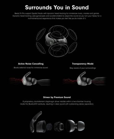 Beats Fit Pro supports Spatial Audio with dynamic head tracking for immersive music, movies, and games². Dynamic head tracking uses gyroscopes and accelerometers to adjust the sound as you turn your head, for a multi-dimensional experience that makes you feel like you’re inside of it.