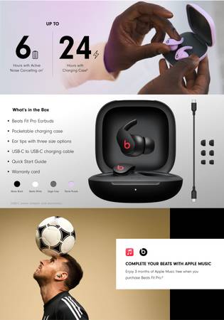 What’s in the Box – Beats Fit Pro True Wireless Noise Cancelling Earbuds; Matching charging case; Eartips with three size options; USB-C to USB-C charging cable; Quick Start Guide.