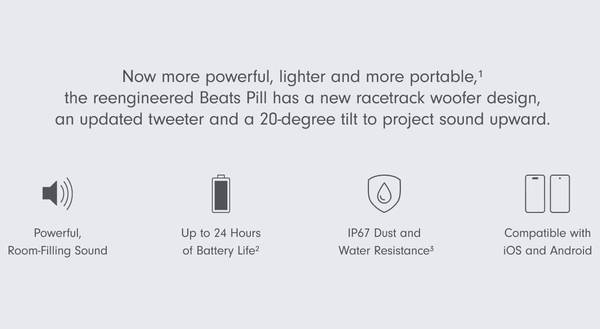 The Beats Pill speaker’s upgraded acoustic architecture delivers more powerful, room-filling sound, bigger bass and improved tonality across the audio spectrum¹