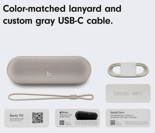 Beats Pill wireless Bluetooth speaker Light Gray, Removable carry lanyard, USB-C to USB-C cable for charging and audio, Quick Start Guide