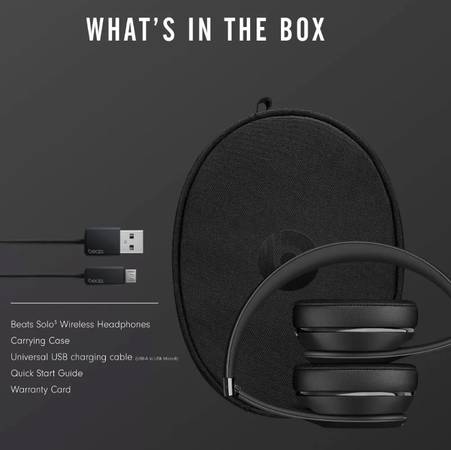 What's in the box - Beats Solo3 Wireless headphones, Carrying case, 3.5mm RemoteTalk cable, Universal USB charging cable (USB-A to USB Micro-B), Quick Start Guide (USB power adapter sold separately)