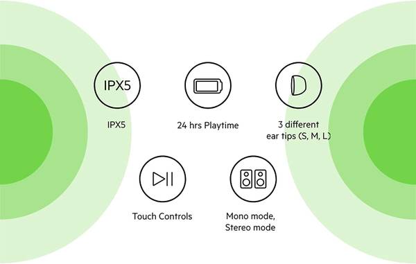 Each of the in-ear headphones respond to touch control for easy on-the-go listening. Pick up calls, control volume, skip or repeat songs with just a touch.