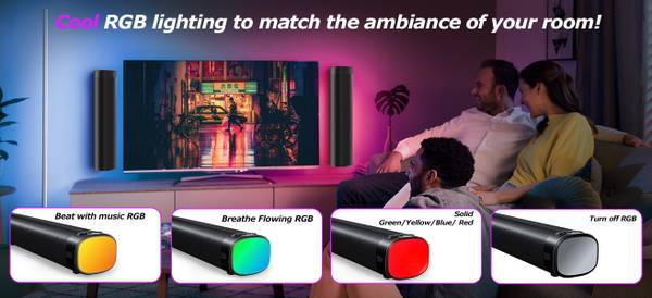 【3 Dynamic RGB Light Modes】 Enhance your viewing and gaming experience with vibrant RGB lighting that reacts to your audio. Control the lights by long-pressing the button on the soundbar or remote to turn them on or off; short-press to switch between 3 modes: Music Sync for beat-driven flashes, Breathe Flow with smooth gradient transitions, and Solid Hue for a single-color atmosphere. Paired with powerful bass audio, the lighting adds atmosphere and immersive energy to any setup