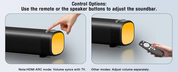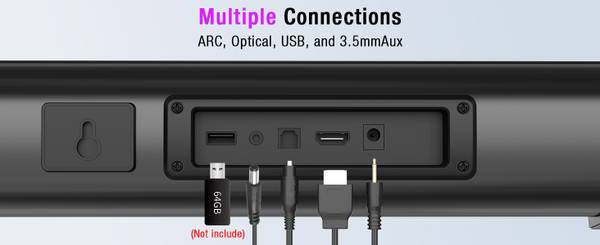 【Multiple Inputs 】Easily connect to your Smart TV, projector, or gaming console via Bluetooth 5.3, ARC, Optical, AUX, or USB. Compatible with many types of TVs and more, this sound bar offers seamless plug-and-play setup for flexible entertainment. Use the included remote to switch, adjust volume, and fine-tune EQ settings. Whether for movies, music, or games, enjoy a reliable and user-friendly experience across all your favorite devices