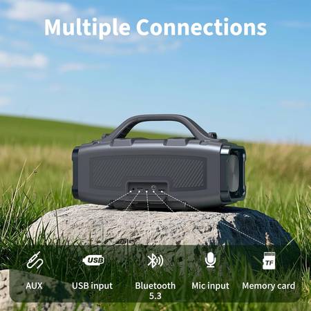 This portable speaker owns Bluetooth 5.3 which ensures fast and stable connection. Besides, it also supports AUX, USB, and TF card. It also has microphone input, and you can plug your wired microphone into this speaker if you would like karaoke.
