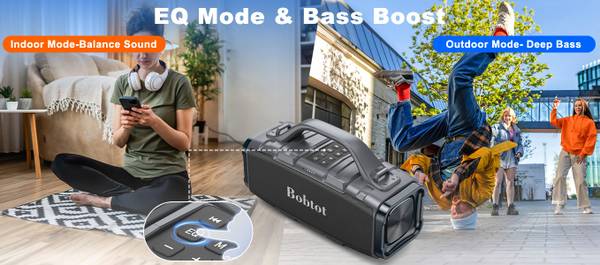 Indoor mode features balanced sound. Outdoor mode features deep bass. You can switch with one click