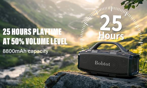 8800mAh battery extends its playtime to 25 hours. Playtime might vary from different volume and music. It can meet your outdoor demands in most of time.