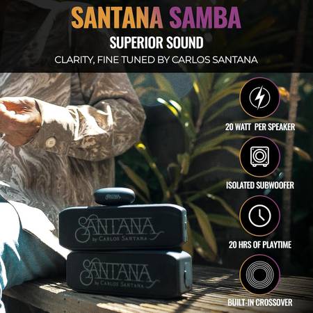 Expertly Tuned by Carlos Santana for Superior Sound Quality: The SANTANA BY CARLOS SANTANA Samba speaker offers superior sound clarity, expertly fine-tuned by the legendary Carlos Santana. Featuring an isolated subwoofer and built-in crossover, the speaker provides rich, balanced audio, making every song come alive with detail and depth.